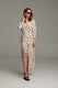 Vestido bicolor, con cuello halter cruzado, falda entallada asimétrica con dos volantes rizados.