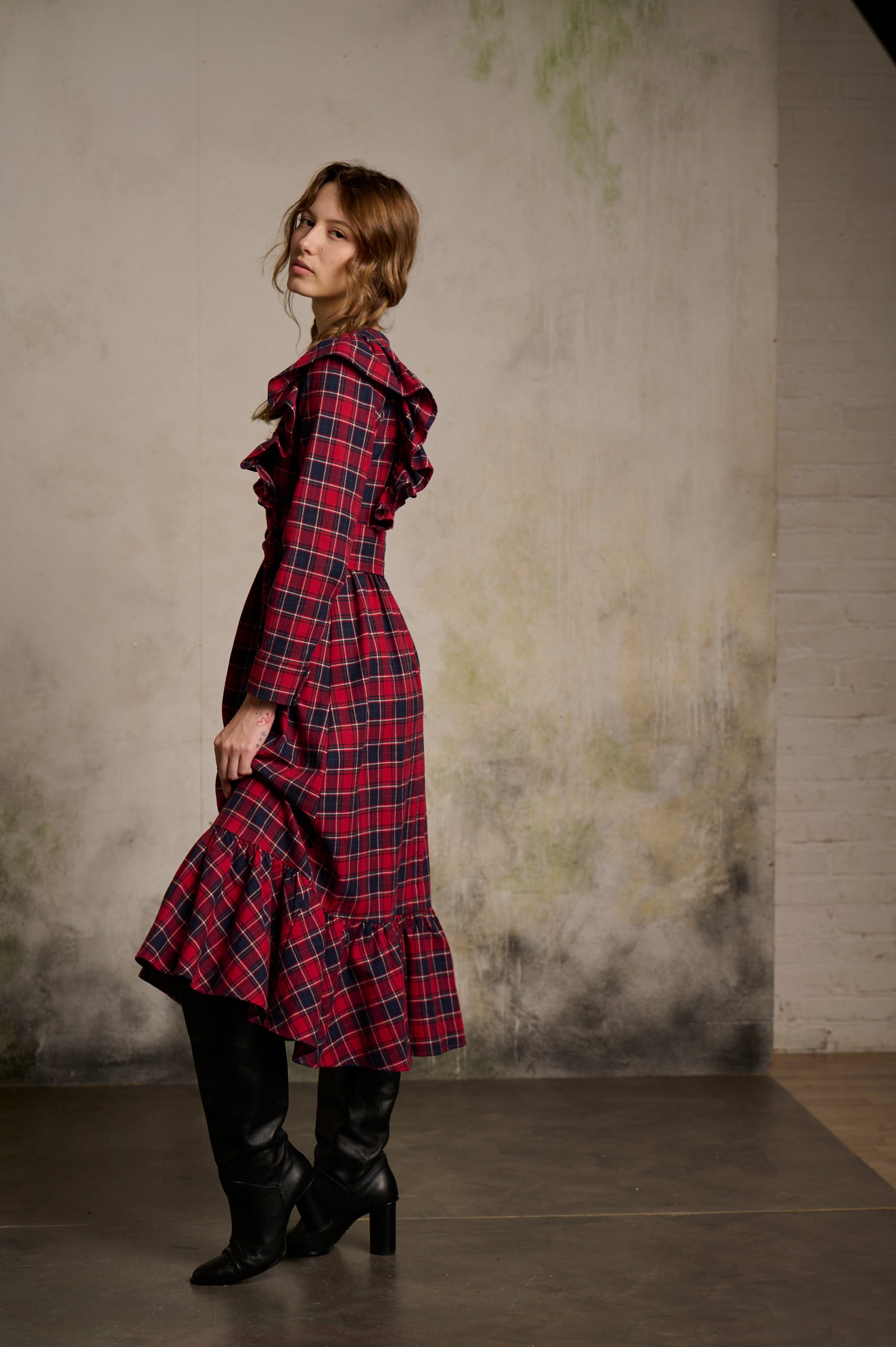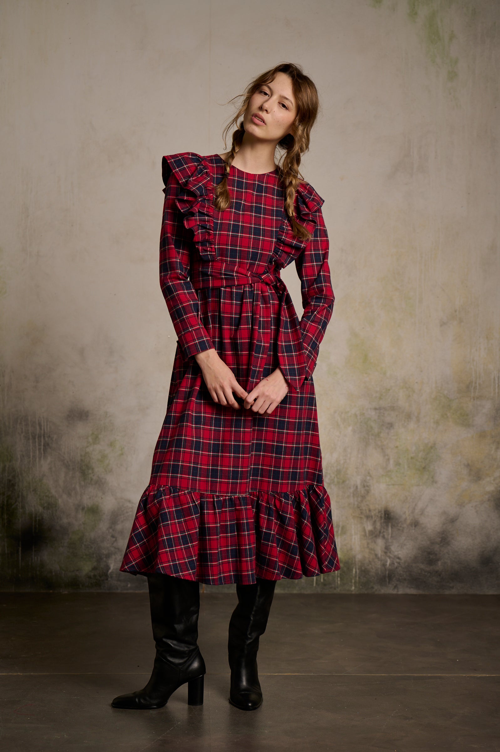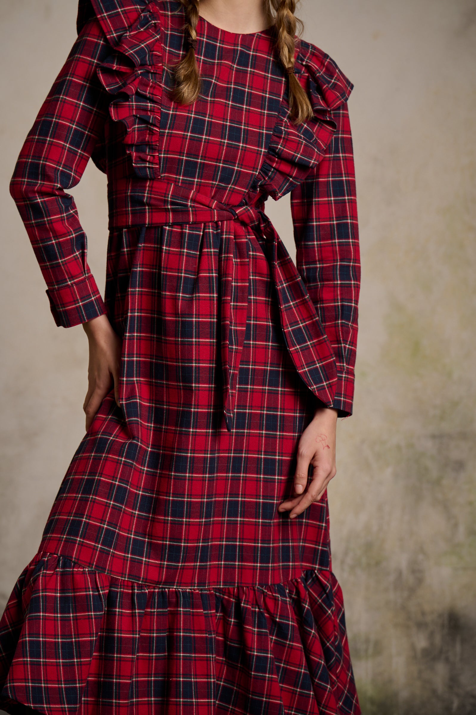 Un vestido de estilo campestre, con pura esencia Maggie, con volantes en el delantero, un patrón súper cómodo y con un cinturón del mismo tejido para ceñir en cintura, una joya que no puede faltar en tu armario.