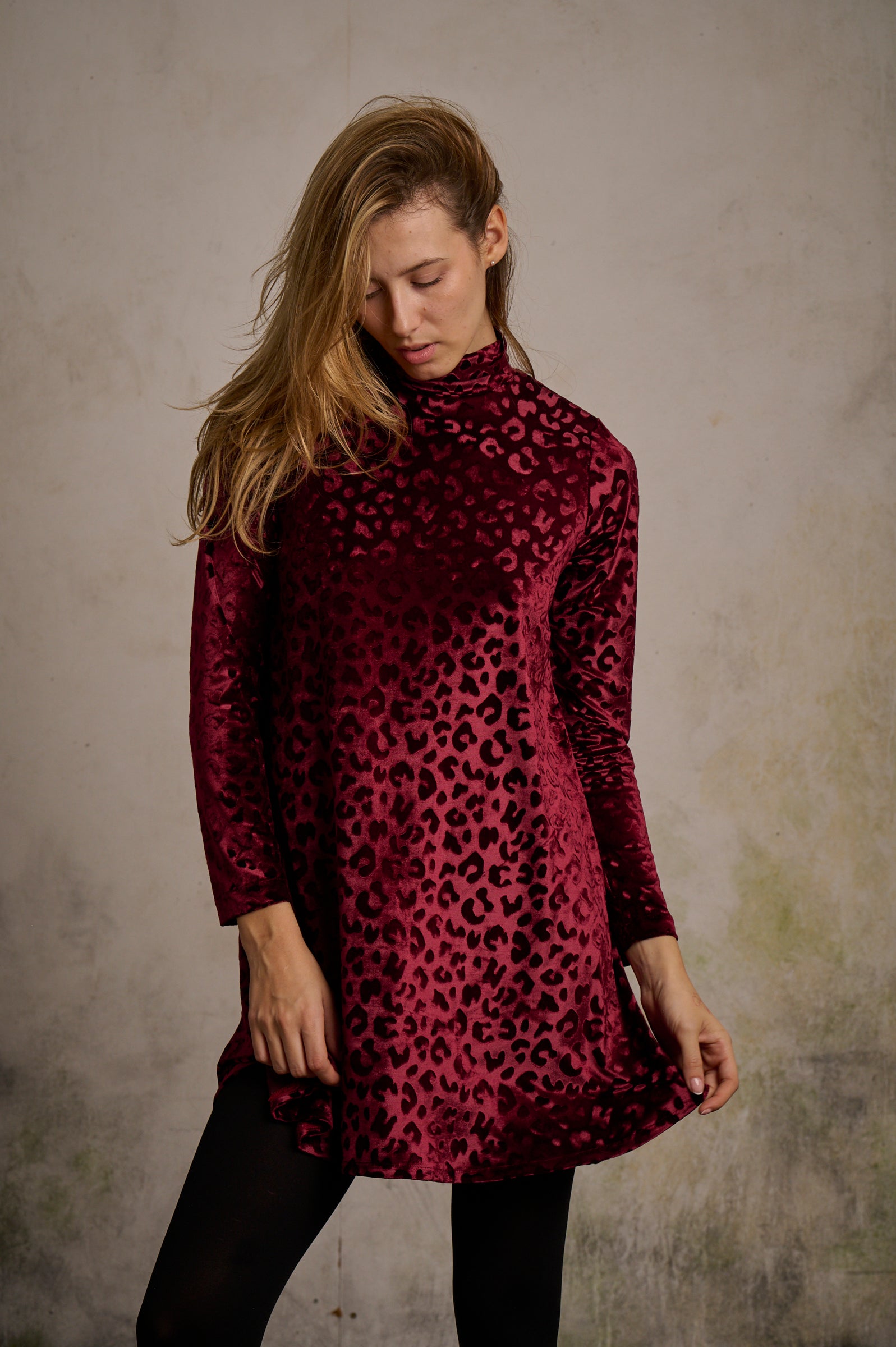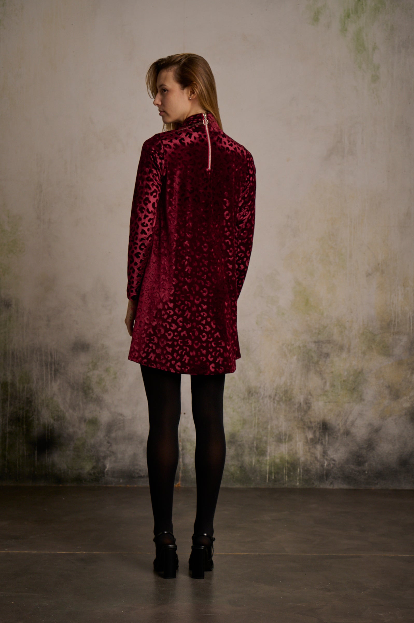 Ficha outfit para las próximas fechas navideñas, el vestido thalía lo tiene todo, la comodidad y la elegancia para las fiestas que están por venir, en tejido de terciopelo haciendo un grabado de leopardo, con cremallera metálica en la espalda y corte evasé.