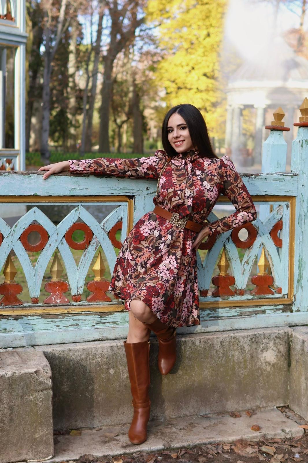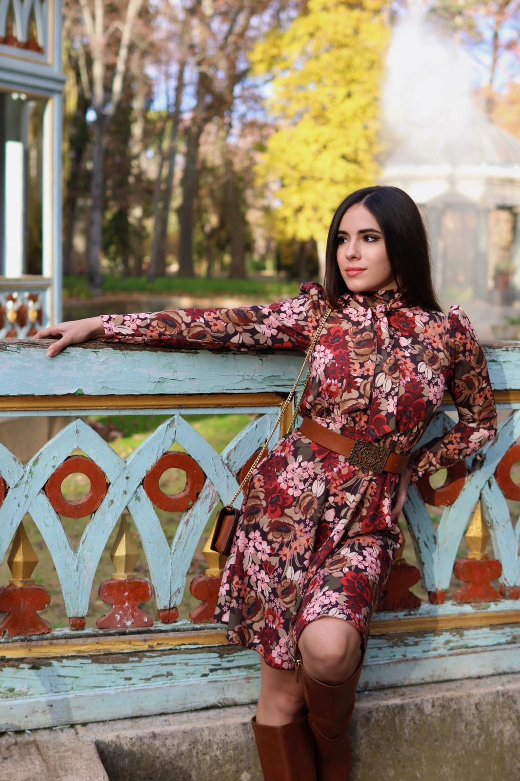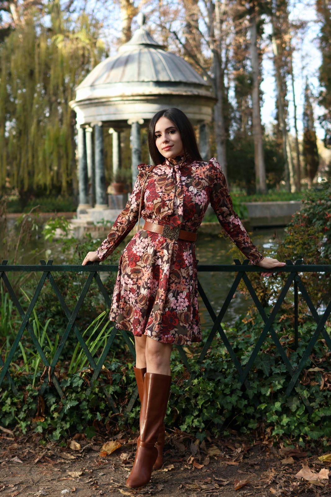 Vestido con cinturilla y parte de arriba ablusada, con cuello alto atado con lazada en la espalda cremallera invisible y falda capeada. Manga larga con rizo en la copa.